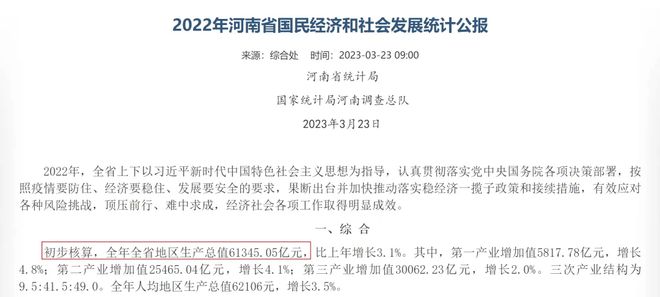 早在2022年的时候,河南就高调宣布,自己的GDP突破了6万亿大关。直到现在,河南省统计局发布的2022年统计公报中,依然写着当年的GDP为61345.05亿元。