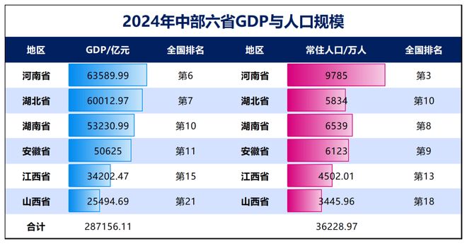 2024年年末,中部六省GDP合计28.72万亿元,占全国GDP比重21.3%。中部六省常住人口合计36228.97万人,占全国人口比重25.7%。