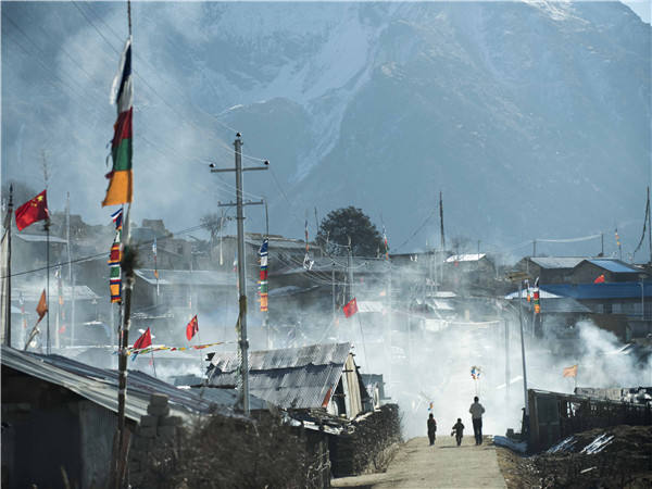 在玉女峰和朗塘雪山的环抱下,位于中尼边境的西藏日喀则市吉隆县吉隆镇乃村,平畴沃野,桑烟袅袅,宛如世外桃源,享受着冬日的宁静和煦暖的阳光。白雪覆盖的田地里,冬小麦已经下种,静待春风吹来。